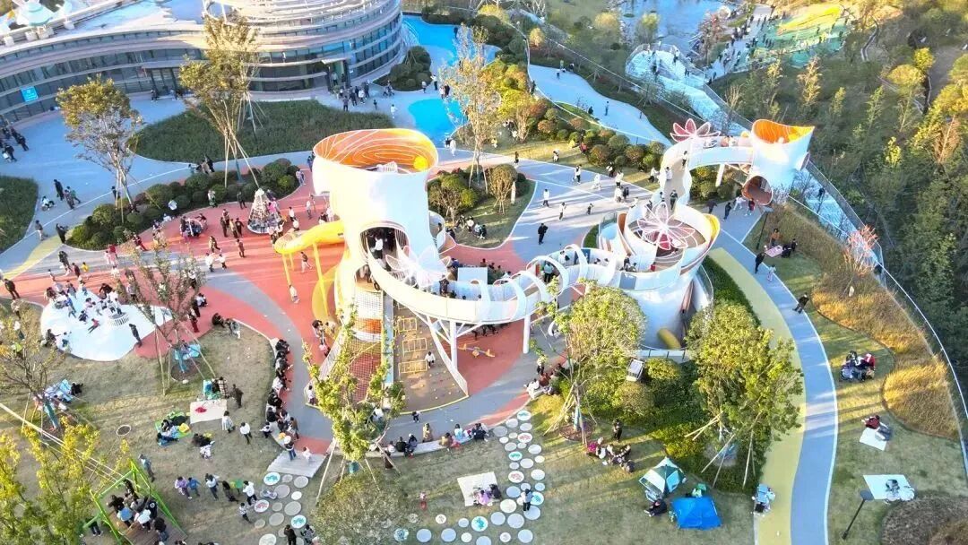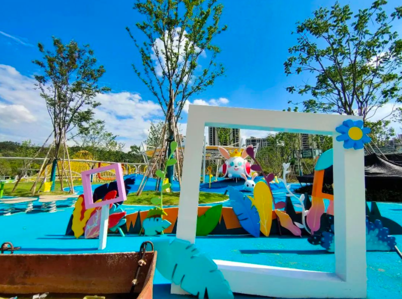 走入公园内,儿童娱乐的元素随处可见,充满科技感的玻璃建筑、可爱的玩偶,还有各种造型独特的中大型游乐设施,漫步公园犹如进入了一个童话世界。