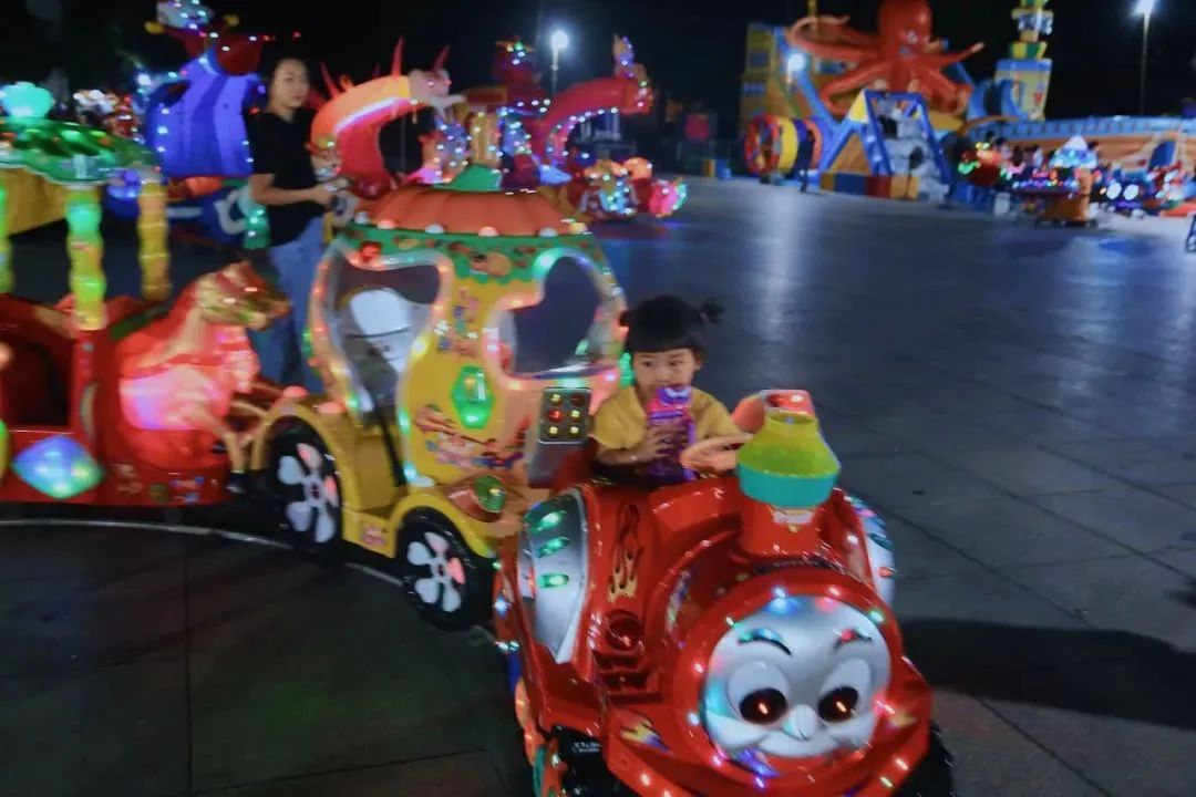 一排排闪烁霓虹灯光的小汽车拉风又时尚,淘气堡更是成为了小朋友的小小基地,太空玩沙区域摇身一变公园内的热门项目,拿起小网捞泥鳅的孩子可爱至极。